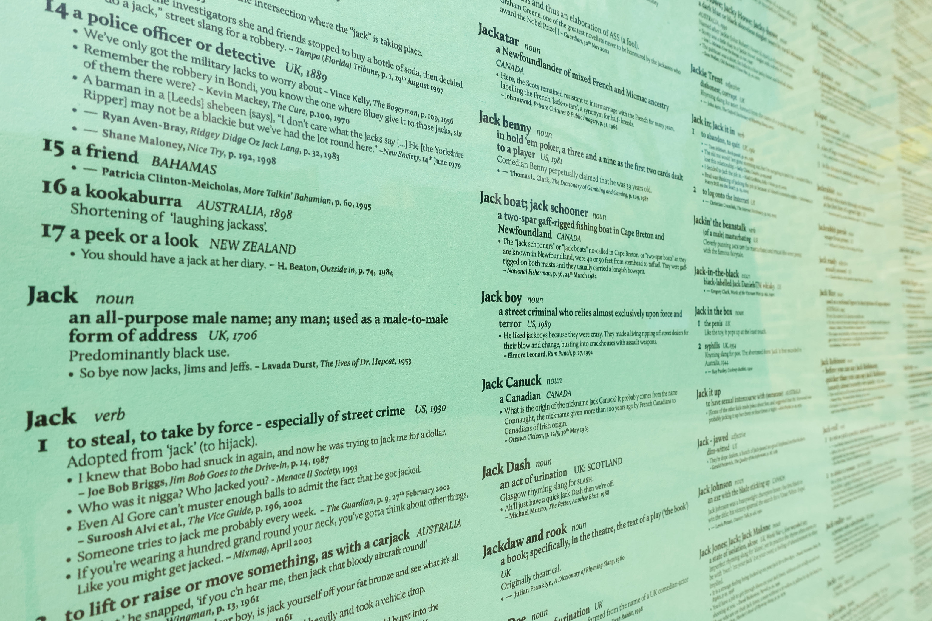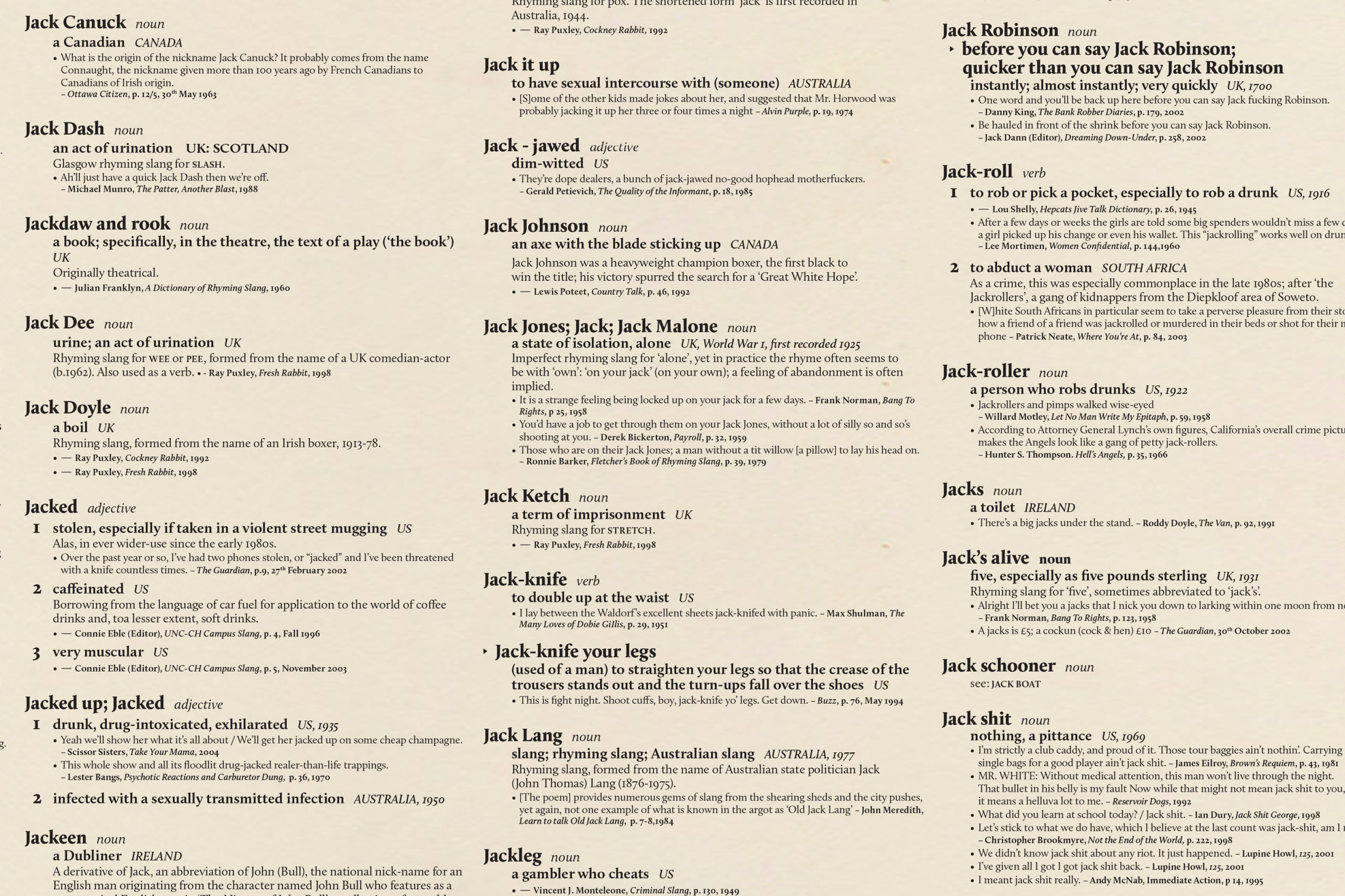 :: A personal project to produce a visual compendium of the name “Jack” found in slang, jargon, lingo and idiom contexts. Layed out in a dictionary layout format with; word, origin, definitions, and their etymologies. - A1 Poster